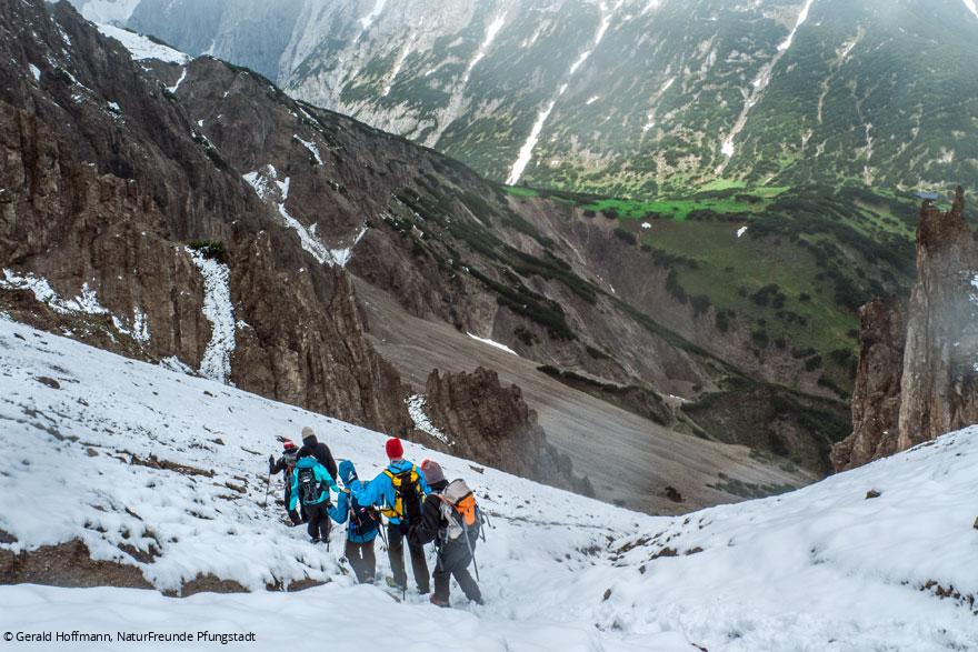 Sommerliche Schneefälle machten die Besteigung des Schnöllplatzls (2.131 m) dann durchaus anspruchsvoll: eine Stelle im zweiten Schwierigkeitsgrad, Fixseil mit Knoten setzen, Spuren legen und die richtige Reaktion bei Stürzen auf sommerlichen Schneefeldern üben, eine der Hauptunfallursachen im Gebirge! Schließlich das sogenannte „Abfahren“ im losen Geröll: eine Art Schuttgleiten in Bergschuhen. Dabei ging es sowohl um Sicherheit, als auch den Schutz der Pionierpflanzen.