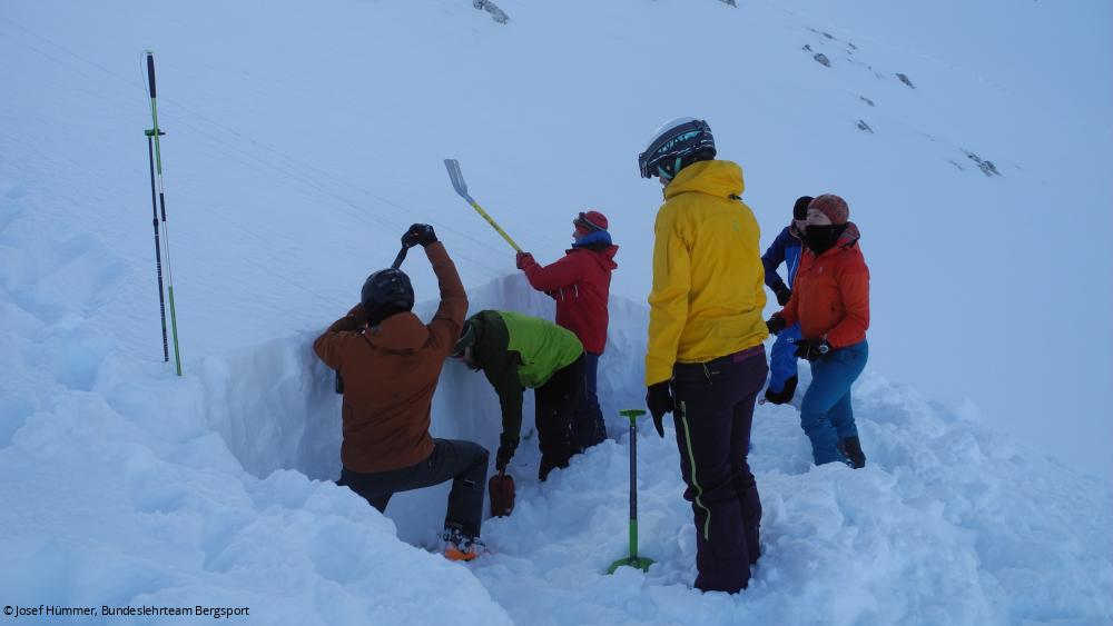 Die 12 Teilnehmer brachten dazu gute Voraussetzungen in der Lawinenkunde und in der Führungstechnik mit. Die Lehrinhalte wie Schneeprofile, Blocktest, Planung und Führungstechnik, und die Lawinenproblematik wurden von den Ausbildern verstärkt ausgebildet und vertieft.